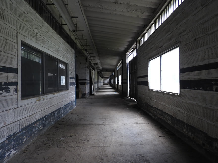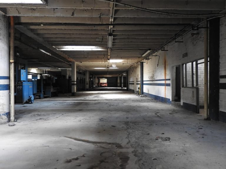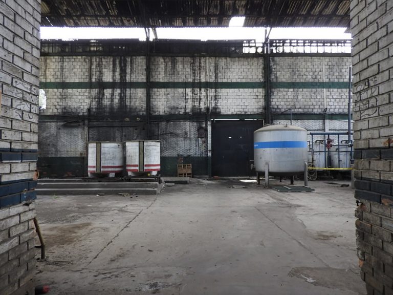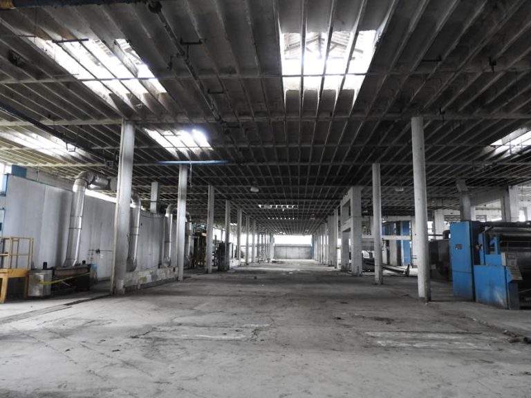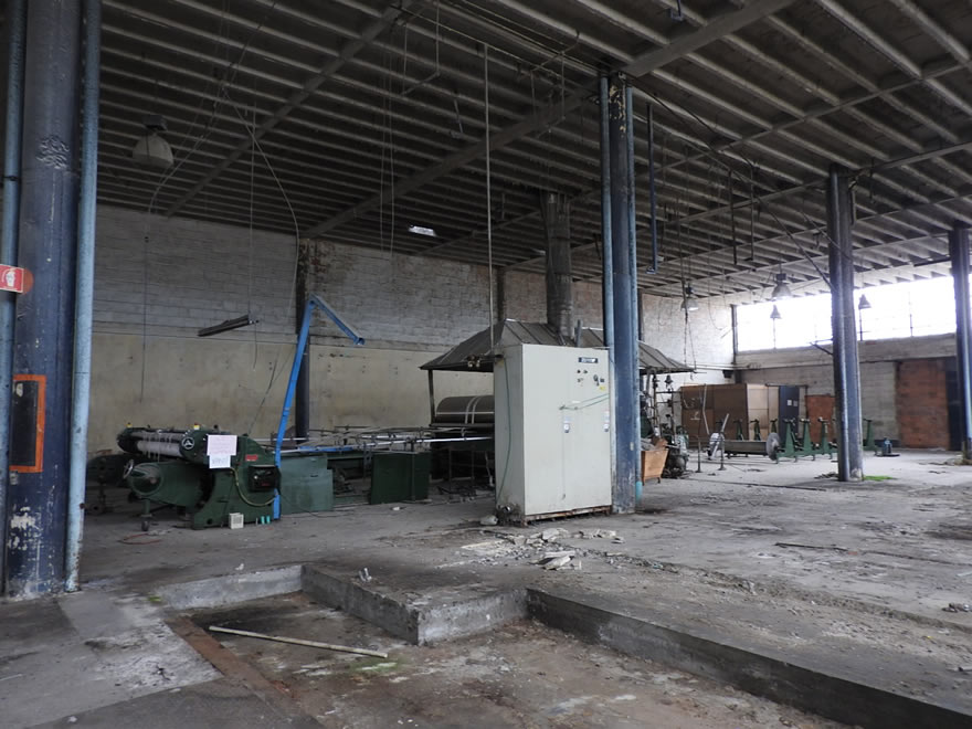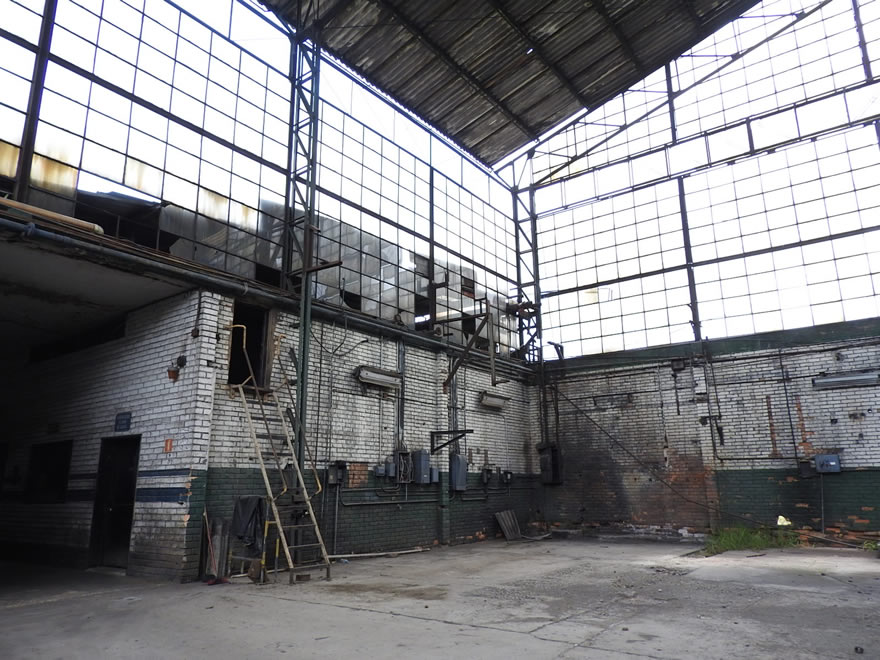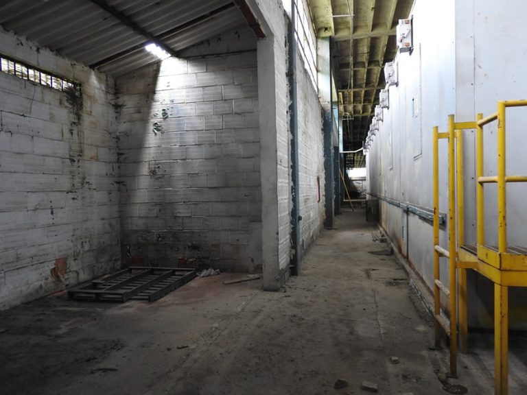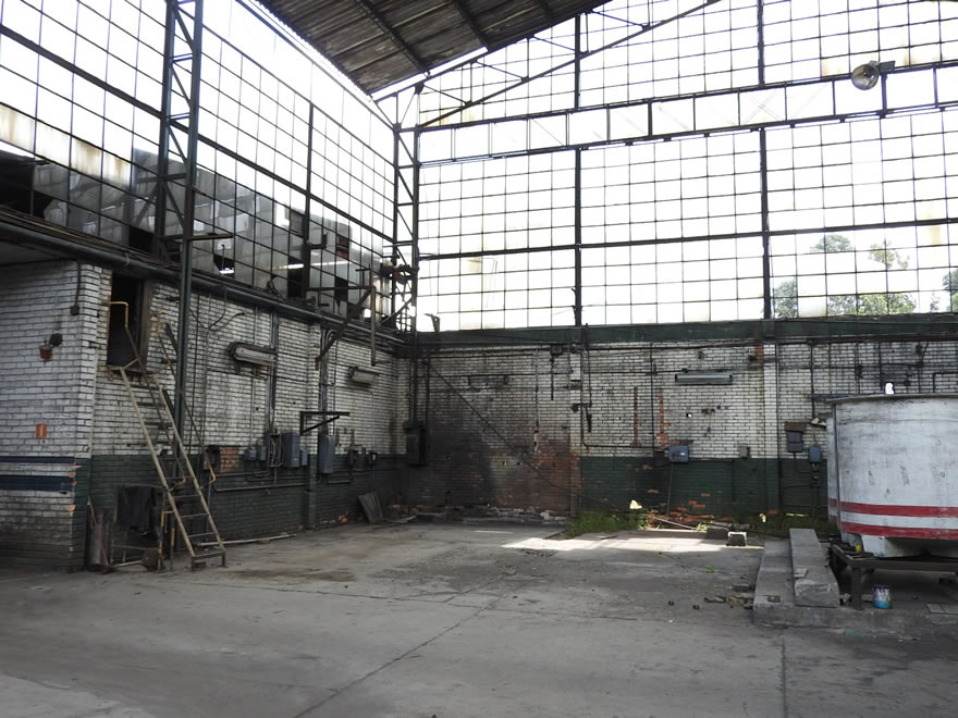 Bodegas deterioradas y abandonadas, maquinaria de gran tamaño, tejados deteriorados con entradas de luz, pasillos amplios.