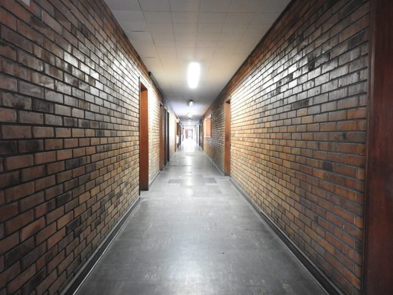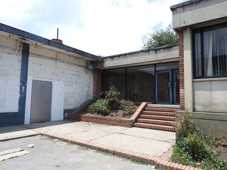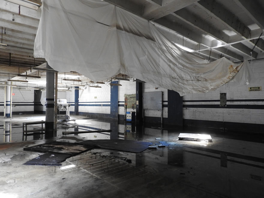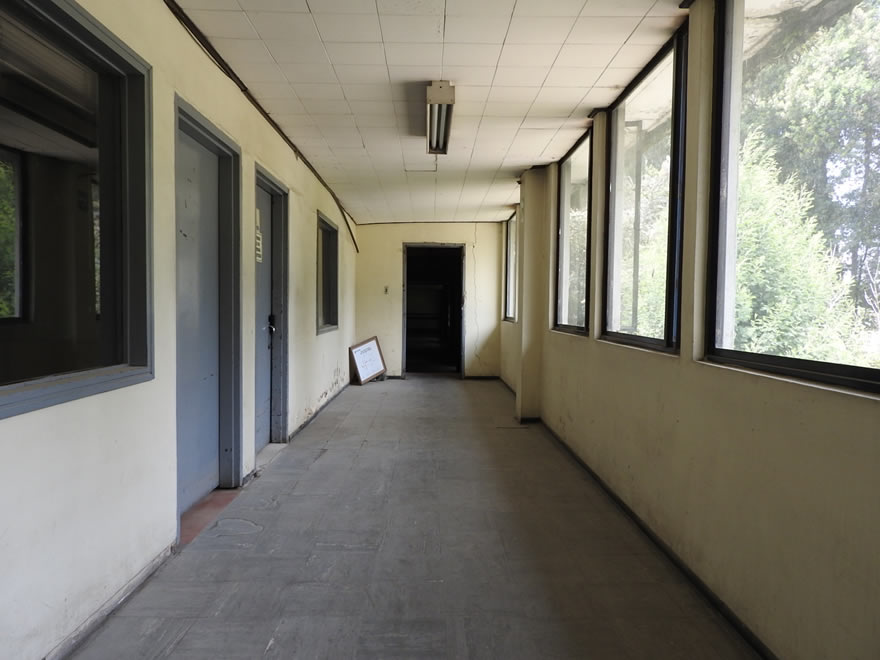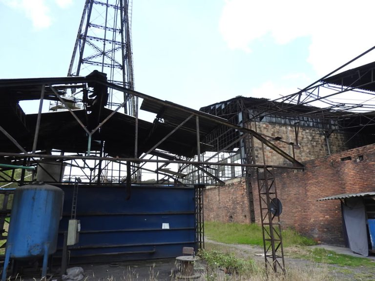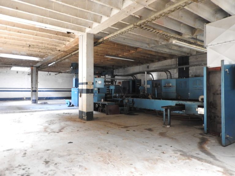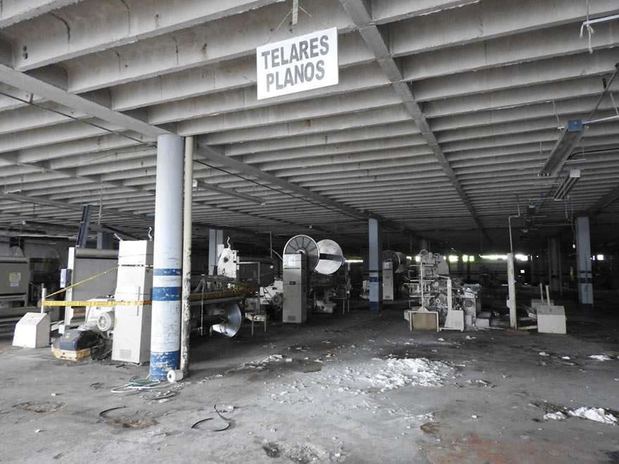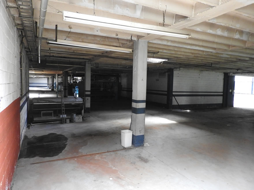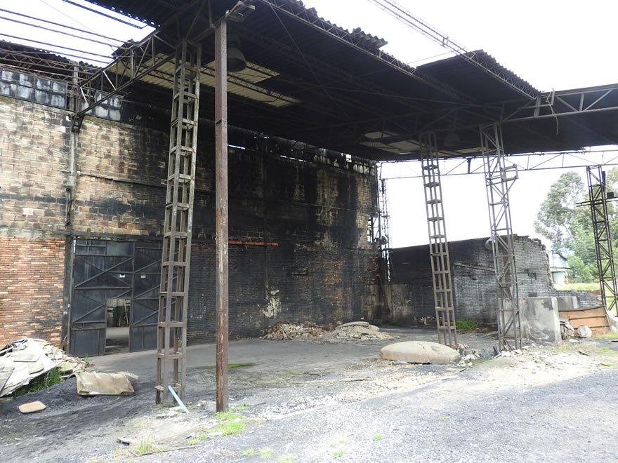 Bodegas deterioradas y abandonadas, maquinaria de gran tamaño, tejados deteriorados con entradas de luz, pasillos amplios.