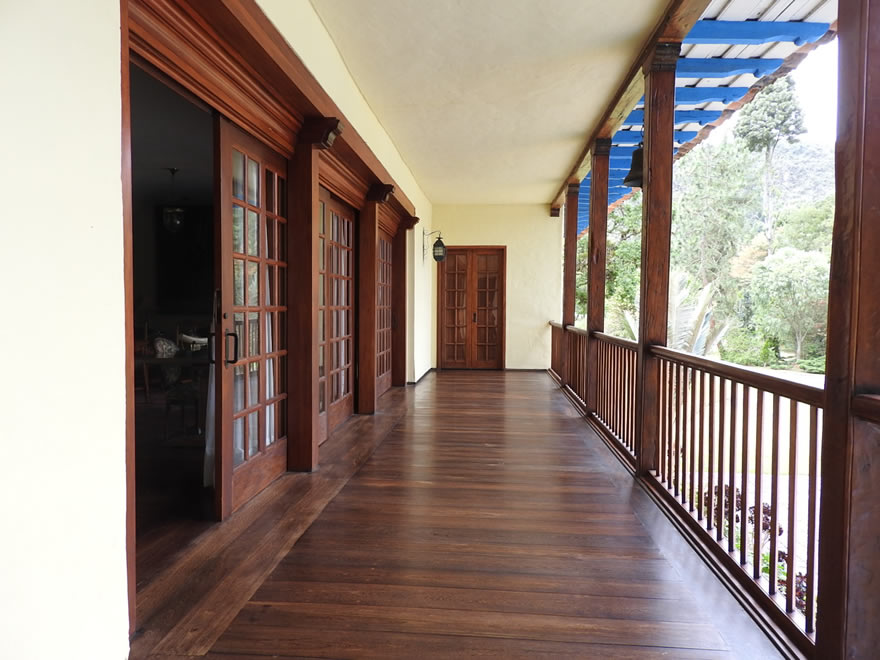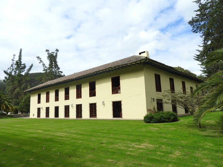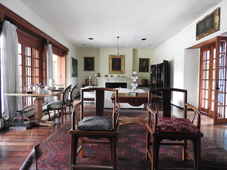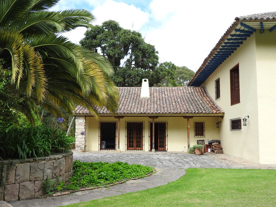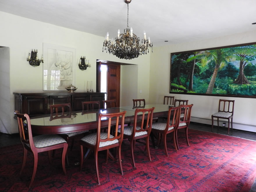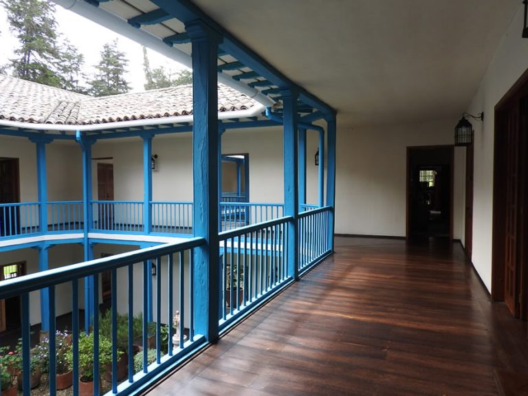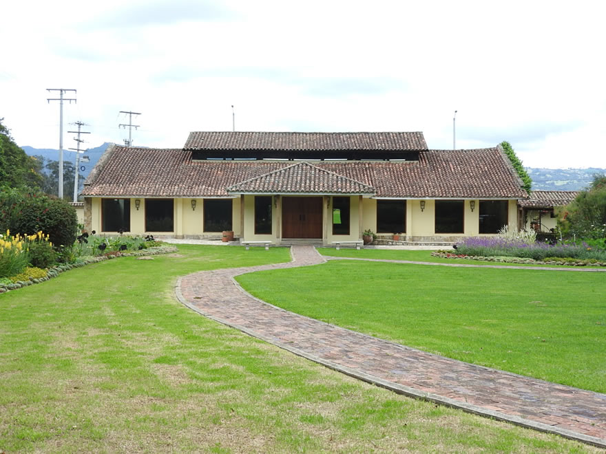 Hacienda con jardines de flores, lago, pasillos amplios con jardines internos, paredes amarillas, balcones y mobiliario gran tamaño, cuadros grandes.