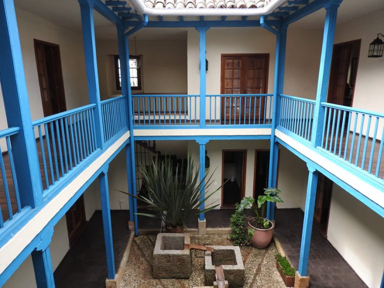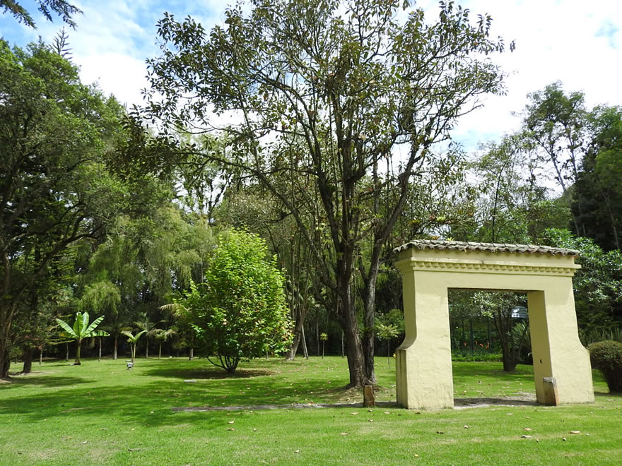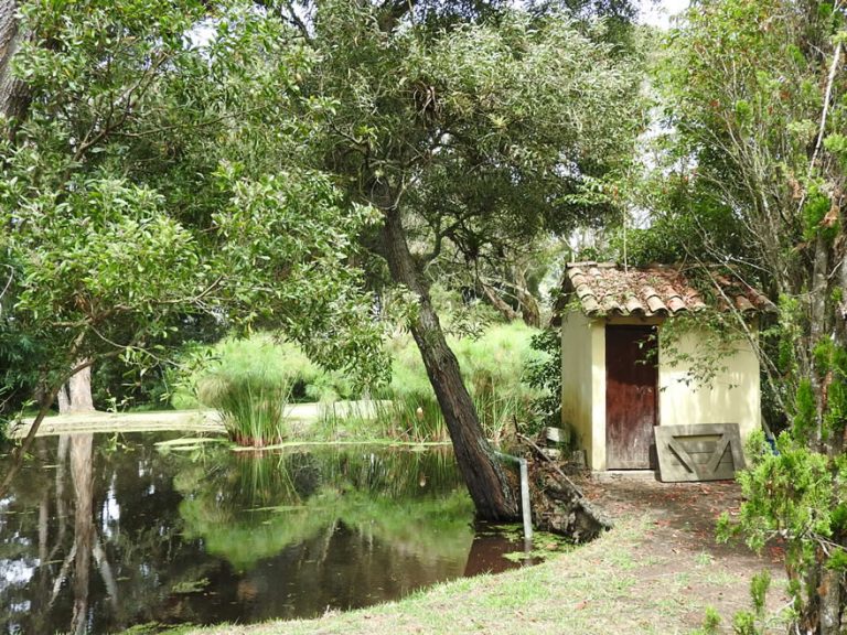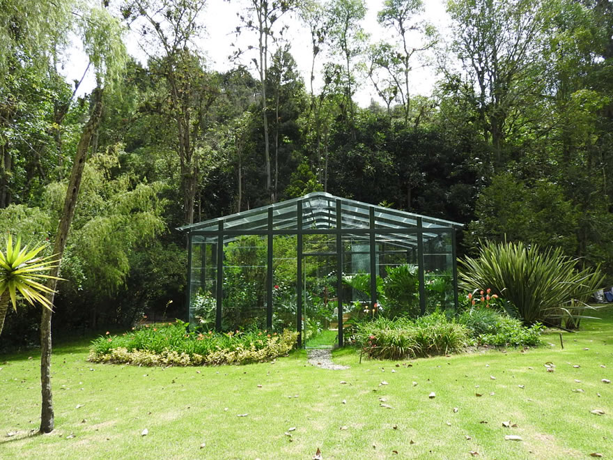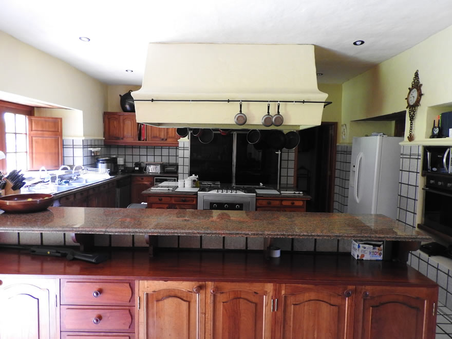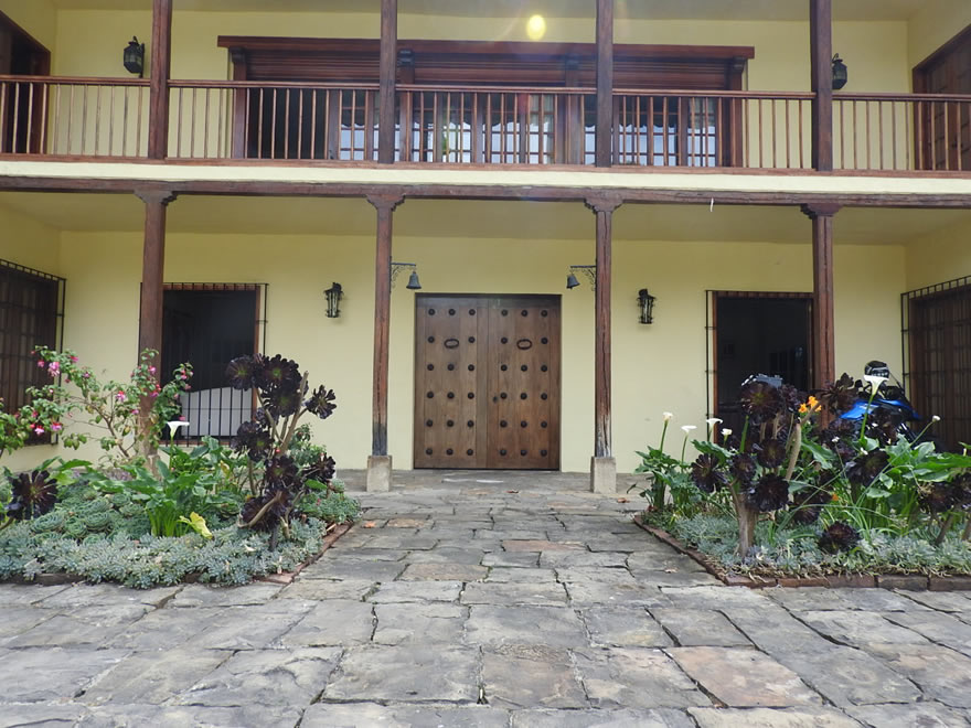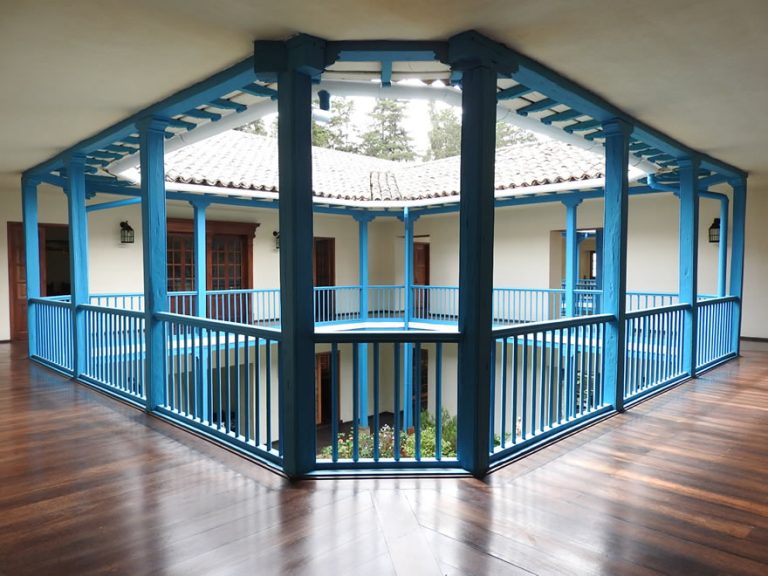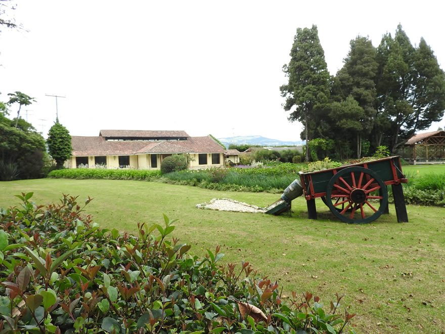 Hacienda con jardines de flores, lago, pasillos amplios con jardines internos, paredes amarillas, balcones y mobiliario gran tamaño, cuadros grandes.